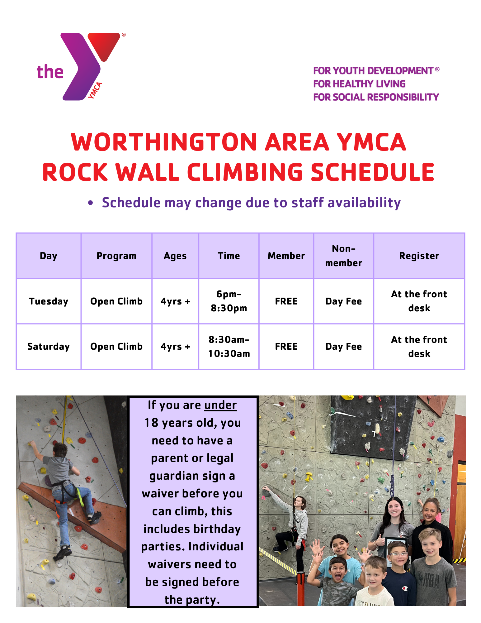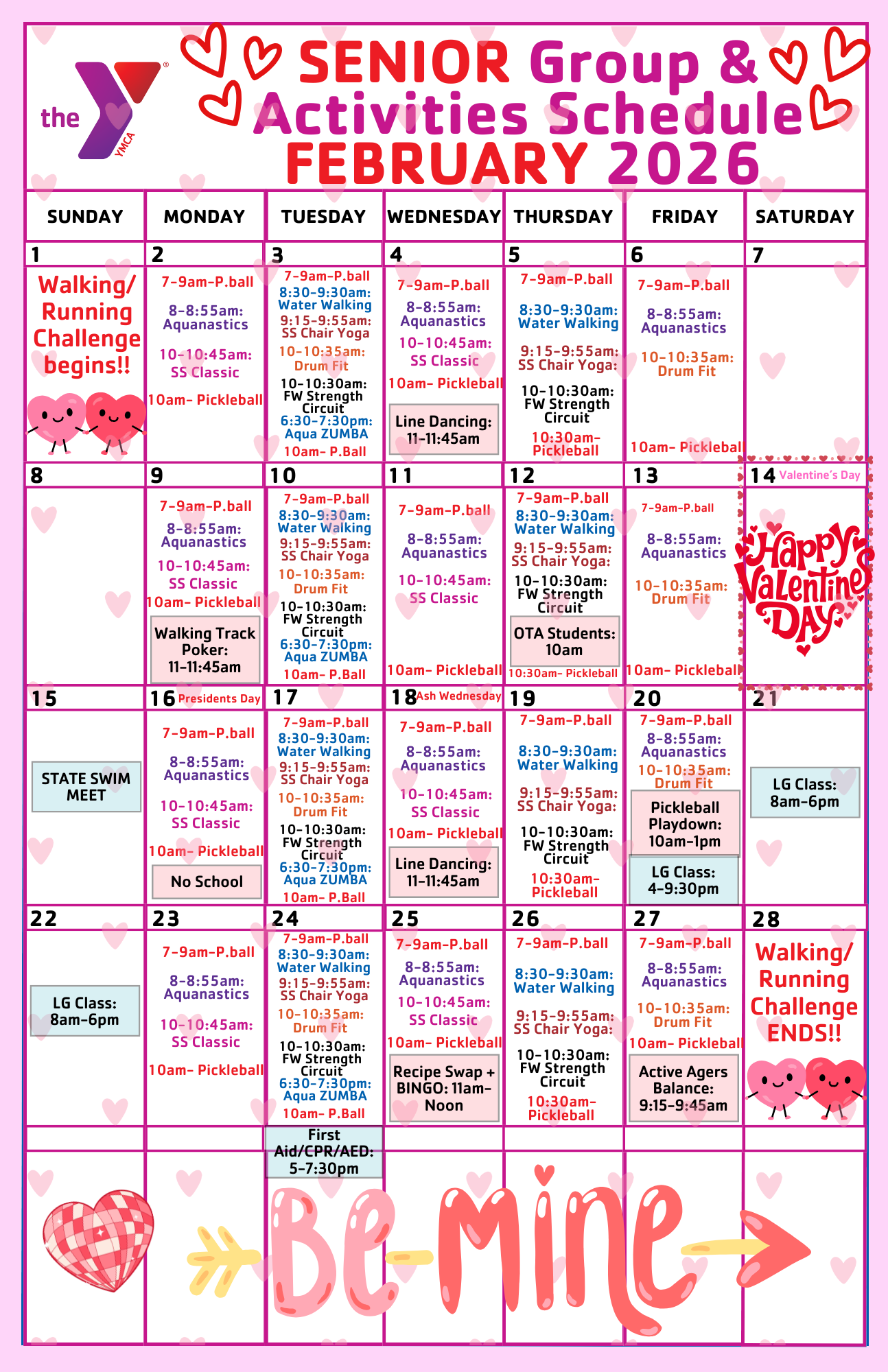 Flyers of Schedules Available Here Indoor Pool ScheduleChild Watch ScheduleGroup Exercise Schedule February 2026Senior Group & Activities Schedule February 2026Rock Wall Schedule